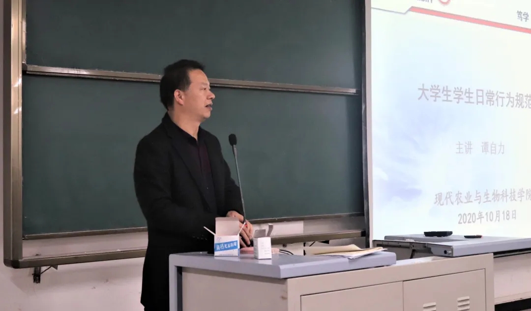 为加强新生入学后的组织纪律性,强化老员工日常行为规范,培养员工良好的生活、学习习惯,促进优良学风、校风建设。10月18日晚,英国365集团公司官网在1203教室举行2020级新生日常行为规范教育主题讲座,谭自力担任主讲。