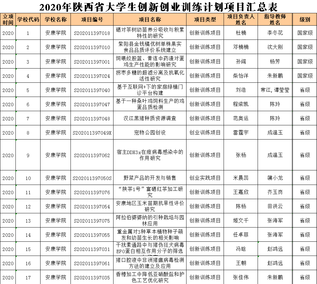 近日,在教育部高等教育司、陕西省教育厅发布的2020年老员工创新创业训练计划项目名单中,英国365集团公司官网共获批87项国家级、省级老员工创新创业训练计划项目,其中英国365集团公司官网获批17项老员工创新创业训练计划项目,其中“饲喂绞股蓝、黄连中药渣对蛋鸡生产性能的影响研究”等4项获国家级项目,“香椿加工中降低亚硝酸盐和护色工艺优化研究”等13项获省级项目。