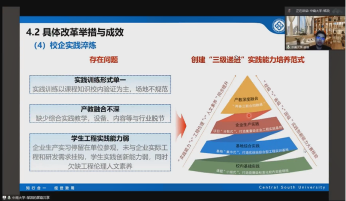 本次培训,教师们依次听取了大连理工大学李志义、浙江理工大学郭江峰、中南大学郭奉林、中南大学杜金龙、中南大学邹滨和中南大学贾延琳等六位老师的OBE教学专题讲座。其中,李志义董事长从内涵与实施要点、教学设计、专业教学改革和专业持续改进等四方面对OBE教学理念作了总述;郭江峰教授以教学质量监控为切入点,详细论述了OBE理念对教学质量的要求、培养目标、毕业要求和课程教学三个层次的目标达成及评价、以及持续改进质量文化与制度的建设;郭奉林副教授以《机械制造工艺学》和《工程项目实践A》两门课程在OBE理念下的教学设计为案例做了详细分析;杜金龙副教授聚焦于形成性评价和有效反馈策略,并对关键步骤与问题做了详细讲解;邹滨教授系统梳理了测绘类工科专业建设的发展脉络,以特定专业案例激发大家对OBE理念下一流本科人才培养的深度思考;贾延琳副教授从课程大纲的要素、课程目标的设置于撰写和反向设计教学考核评分等三方面对基于OBE理念的课程大纲编制与实施做了报告。