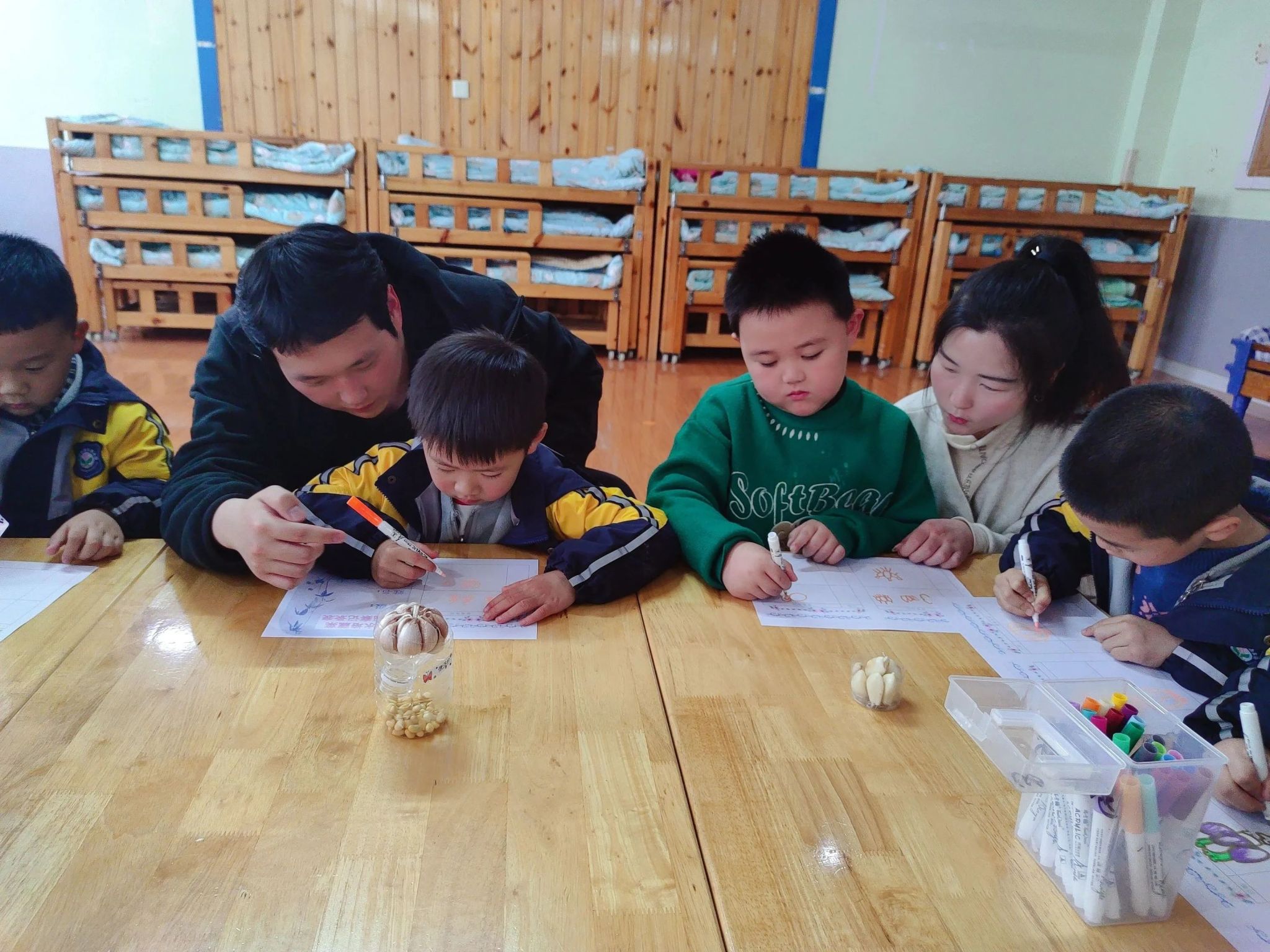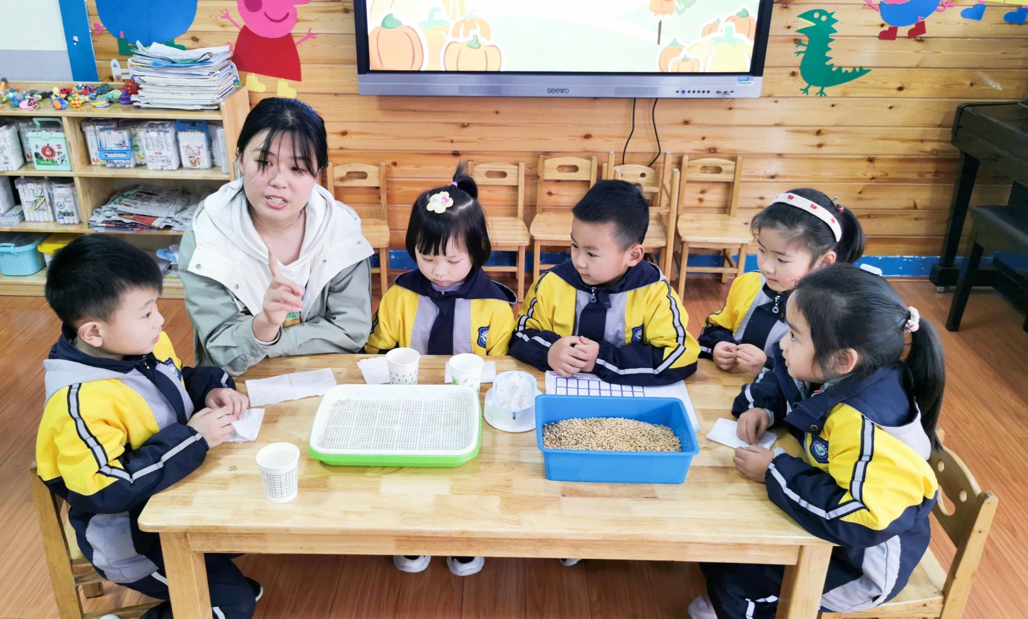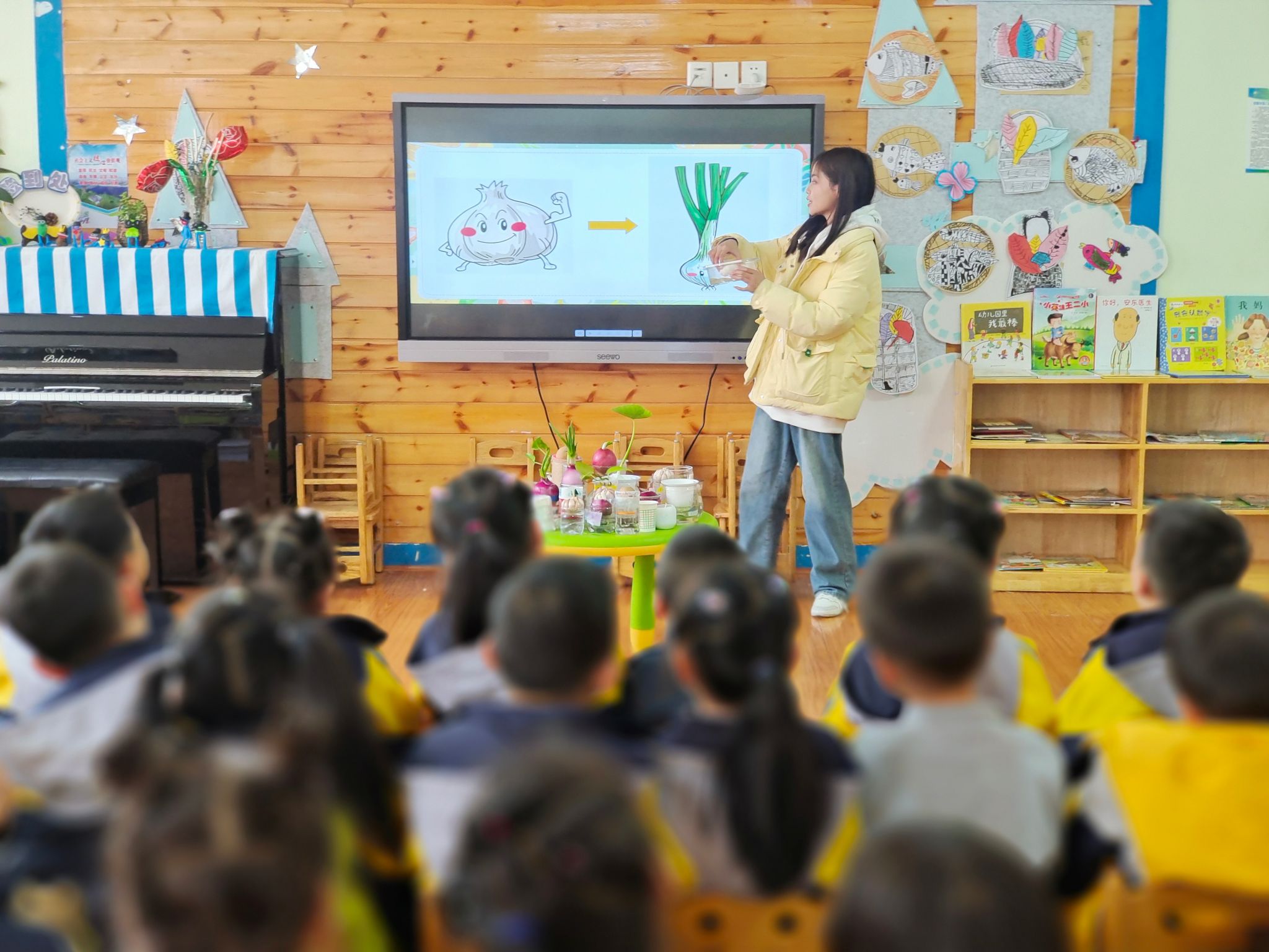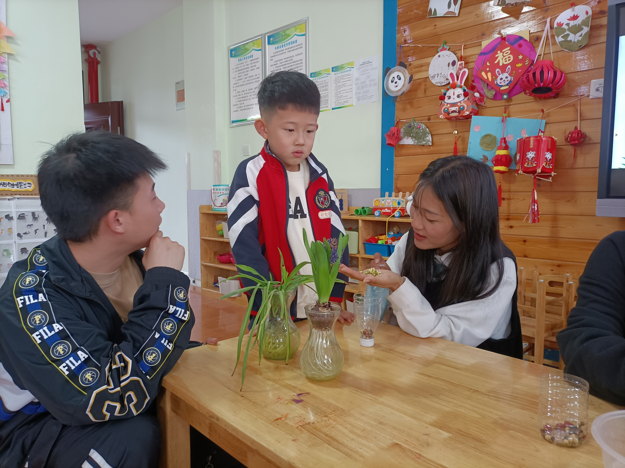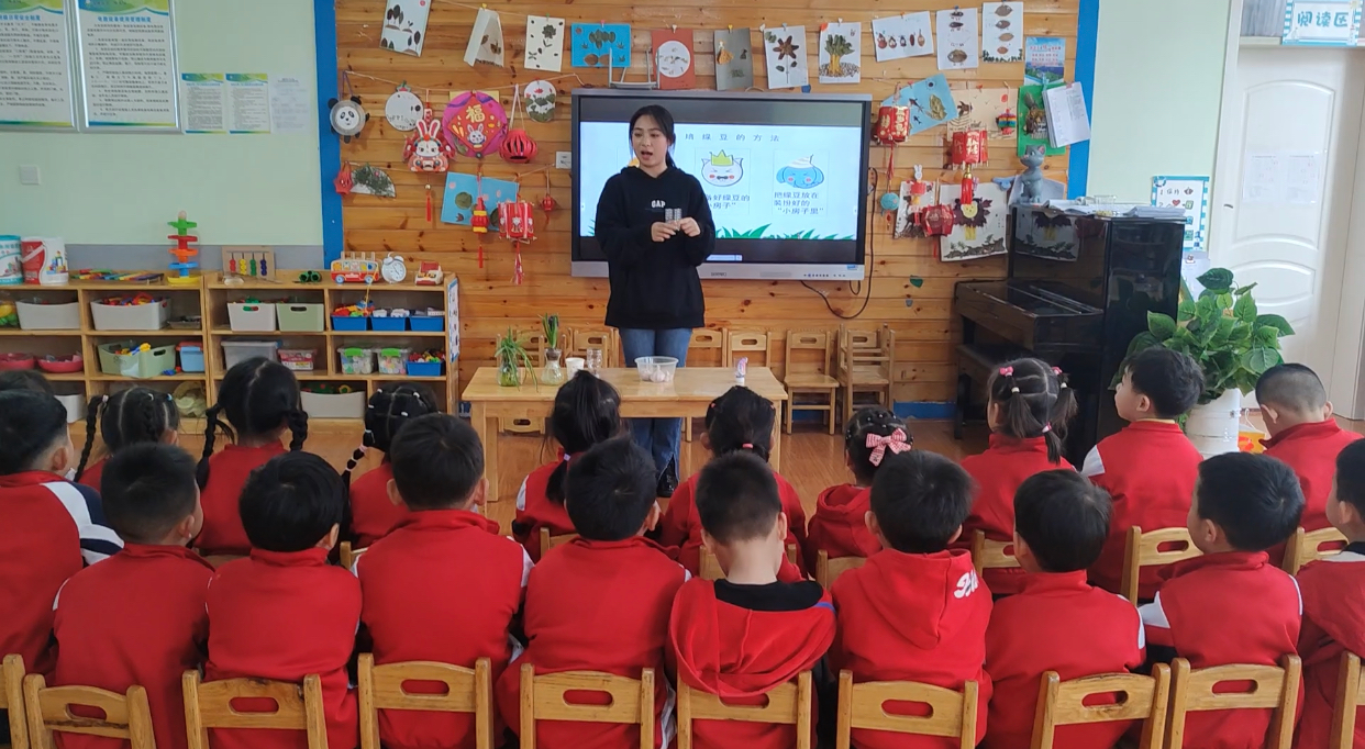 到达幼儿园后,同学们化身科普教师,围绕“水培蔬菜”,为小观众们带来了趣味科普小课堂。“小教师们”分小组到不同班级,为小朋友们分别介绍了“水培小麦”、“水培大蒜”、“水培绿豆”等一系列水培蔬菜的特点,让小朋友们近距离地感受了现代农业科学的魅力,也激发了他们对水培蔬菜的兴趣。在互动环节“你制作过水培植物吗?”使现场气氛更加热烈,小朋友们踊跃举手发言,发表自己的看法。