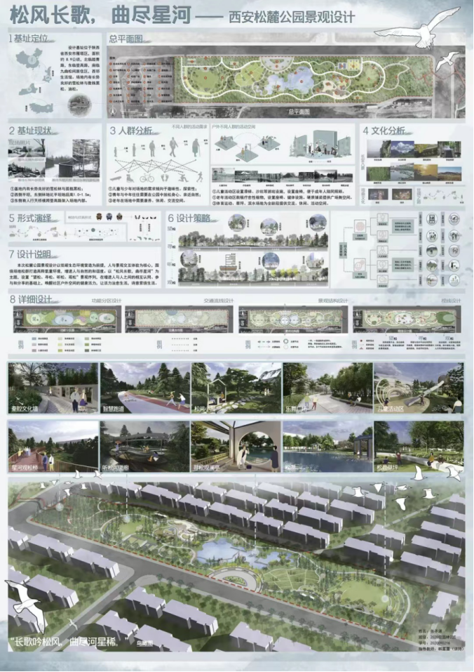 本次毕业作品设计展以创造美丽景观为目标,以人为本,考虑园林的功能性需求,并提供良好的视觉享受,创造美观、实用的园林景观,包含综合公园、社区公园、居住区公园、游园等类型。
