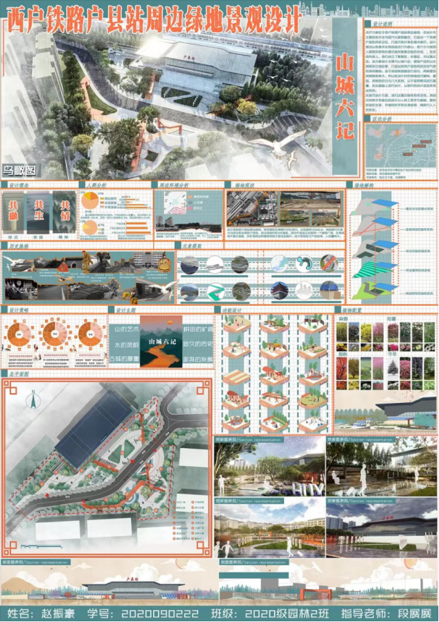 本次方案位于西户铁路户县站周边绿地.在设计中注重传统文化与现代元素相融合,打造出一个传承户县的历史记忆.打造开放共享的城市客厅。设计理念以传承文化和创造活力为核心.致力于为使用人群提供具有休憩功能和集散功能的空间。在空间布局上,我们设立了集散区、休憩区、文化展示区。该方案设计主题为山城六记,提取户县的山水格局和古城印象,打造出具有户县特有的空间气质和场所精神。由于场地被道路进行划分,两侧建筑风格相差较大,所以在设计时对场地进行解构、重组,将场地切分为六大系统,以千层饼模式进行重叠在此基础上进行设计,以现代的设计语言来表达传统。