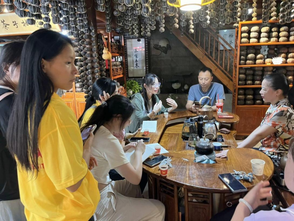 在石泉县城关镇老城社区,实地考察了解当地茶叶门店销售情况,其中以非物质文化遗产——石泉柚子茶最为瞩目,期间石泉柚子茶传承人龙群英向实践团讲解了柚子茶的历史渊源、加工制作流程、健康功效等概况。其中石泉县龙女柚子茶有限公司自2020年成立以来,在当地集茶叶和土柚种植、加工、销售、旅游观光于一体的综合性企业,同时采取“公司+基地+农户”的方式带动周边农户发展茶叶和土柚产业,该做法在石泉县茶产业助力兴旺乡村振兴中发挥了重要的作用。座谈会上,实践团队负责人介绍了公司茶学专业情况,并对柚子茶新产品的开发做了展望。会后,柚子茶传承人龙群英期望校企联合,让更多学子了解并参与,使非遗柚子茶焕发新活力,香飘更远。