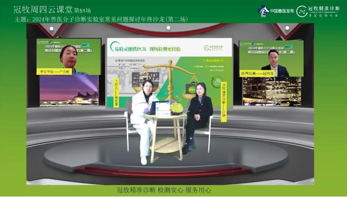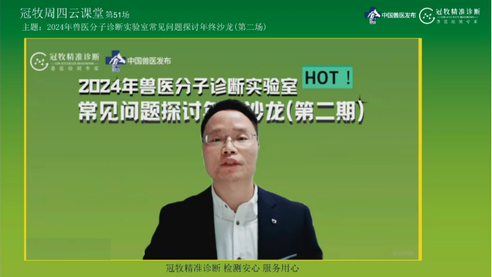 1月16日19:30,湖南冠牧生物科技有限公司2024年兽医分子诊断技术探讨年终沙龙活动在“冠牧精准诊断”与“中国兽医发布”微信平台同步直播,公司赵鸿远博士应邀作为主讲嘉宾参与本次直播活动,参与此次活动的还有中农华检(海南)技术负责人严克霞与冠牧精准诊断培训公司汪颖经理。