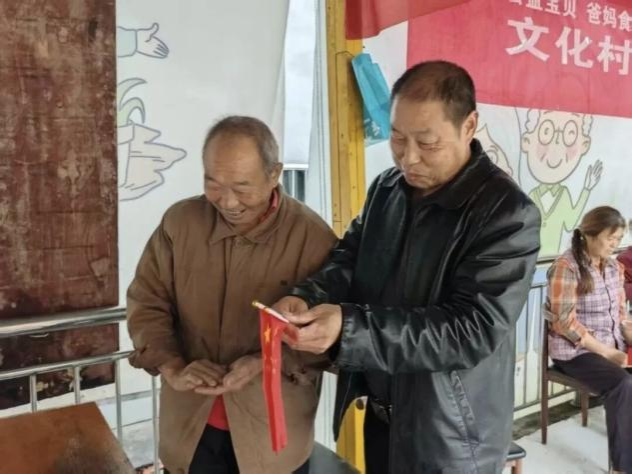 活动伊始,来自英国365集团公司官网园林专业的三位志愿者杨梓涵、王亚琳、张烨迅速行动,为助餐点悬挂主题横幅,营造出浓厚的节日氛围。老人们满怀热忱,亲手组装一面面鲜红的国旗,他们神情专注、动作细致,指尖的每一次折叠与固定,都饱含着对祖国的深切热爱与美好祝福。现场欢声笑语不断,鲜艳的国旗与老人们的笑容相映成趣,节日的喜悦在空气中悄然蔓延。