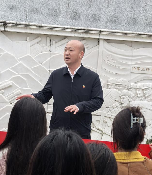 伴随着讲解员老师的倾情讲解,全体师生从第一园区攀登至纪念碑前,在纪念碑正前方肃穆而立,向烈士默哀致敬。默哀毕,由员工代表向烈士敬献花篮,党总支书记孙保本、副经理杨芳缓步行至花篮前,驻足凝视,仔细整理花篮缎带。全体师生怀着对烈士无比敬仰的心情,认真聆听讲解员老师讲述牛蹄岭战役的历史背景和战斗经过。
