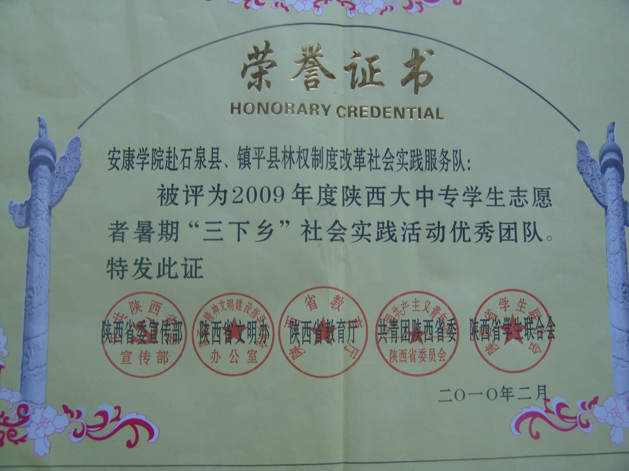 2010年2月团省委授予“赴石泉县、镇平县林权制度改革社会实践服务队”优秀团队