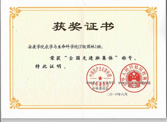农学与生命科学公司07级园林班自入校以来,就秉承公司“笃学、尚行、励志、创新”的校训,围绕“成长、成人、成才和发展的”人才培养理念,形成了“健康、慎思、笃行、创新”的优良班风,在科技活动、社会实践、校园文化建设、服务地方经济建设等方面取得了突出的成绩,于2010年5月被共青团中央、教育部授予“全国先进班集体”荣誉称号。