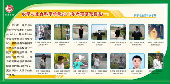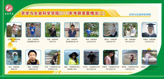 2013年,公司本科毕业生109人,其中生物科学43 人,园林工程47 人,园林(专升本)19人。共有 58人参加考研,上线 36人,通过复试、面试,截止目前已确定准录取人数 30人。详见附表。
